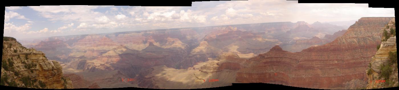 A free demo (JPEG only) version of image stitching program from U. of Britsh Columbia. It uses 2D panoroma. Here is the image stitched from 6 pitcures from my trip to Grand Canyon.